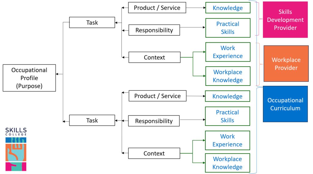 A QCTO occupational curriculum is based on the occupational profile (“job profile”) and its particular tasks. These tasks have associated products / services, responsibilities and contexts, which translate into Knowledge, Practical Skills and Work Experience Modules respectively.